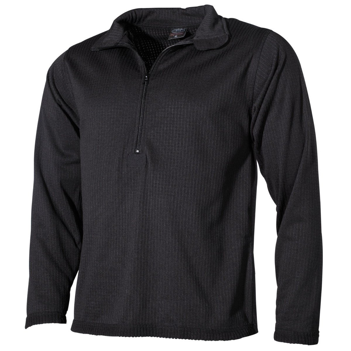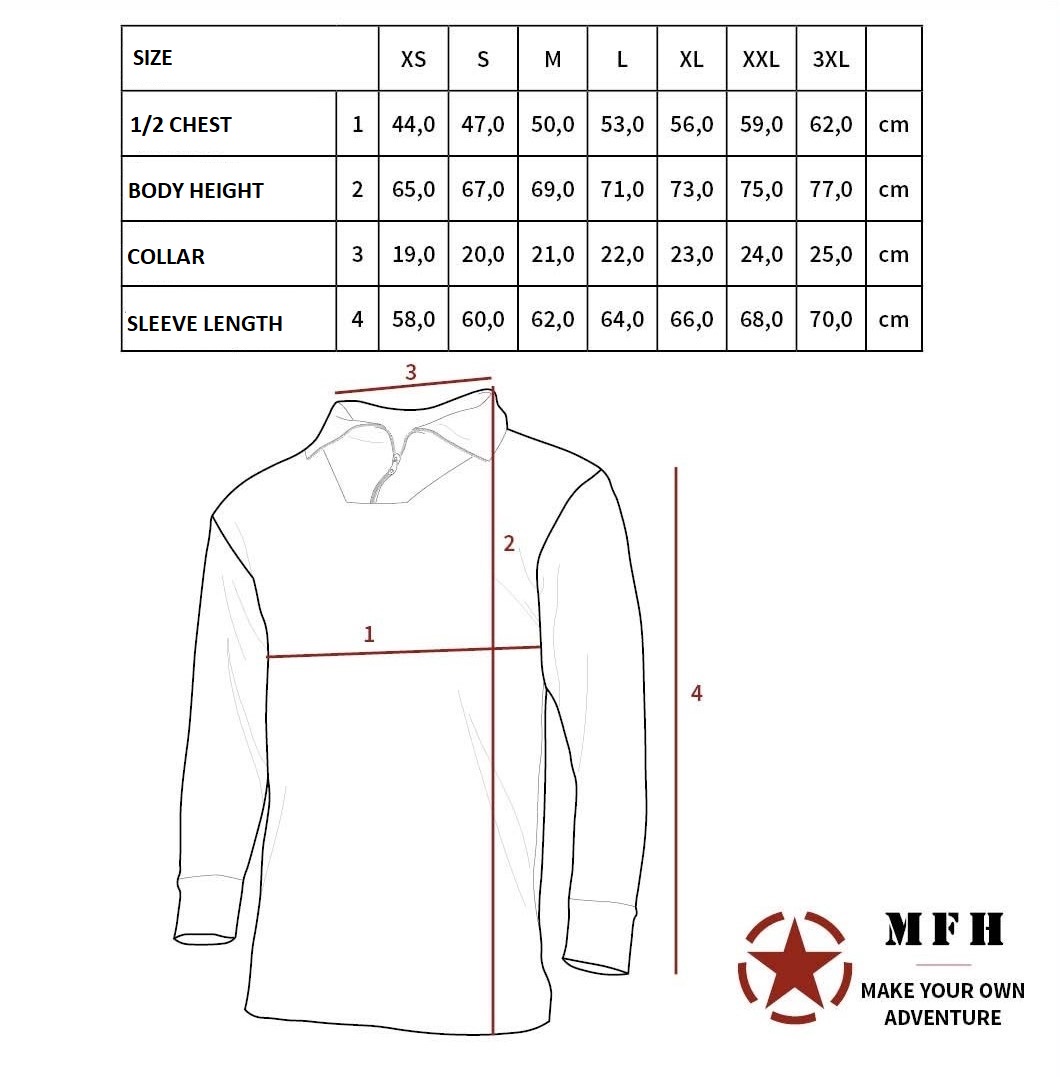 • High quality undershirt from German manufacturer MFH®. The shirt has long sleeves, a high zip collar, breathable moisture regulating material and durable seams.