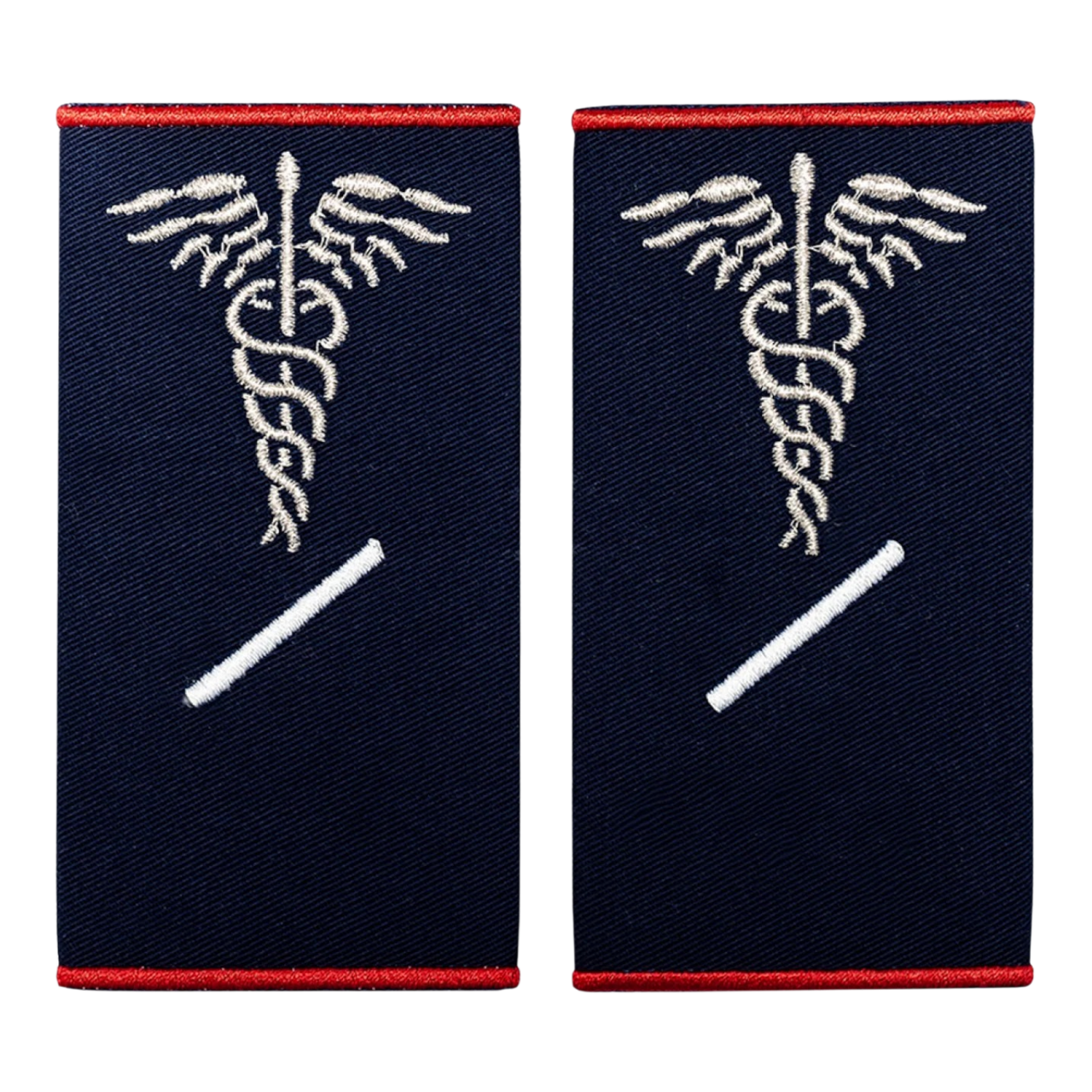 Grade Paramedic Debutant ambulanță tip manșon, tubulare, brodate cu fir Madeira Polyneon, 100% poliester, de culoare roșie și metalică argintie. Conturul exterior este roșu. Întreaga broderie este aplicată pe un material de suport cu întăritură termocolantă din țesătură 65/35% bumbac/poliester. Culoarea suportului este navy și realizează un contrast perfect cu firele folosite la broderie. Datorită utilizării materialelor de cea mai înaltă calitate, gradele pot fi utilizate în exterior, fiind extrem de rezistente la vânt, ploaie, raze solare, precum și la spălări multiple.