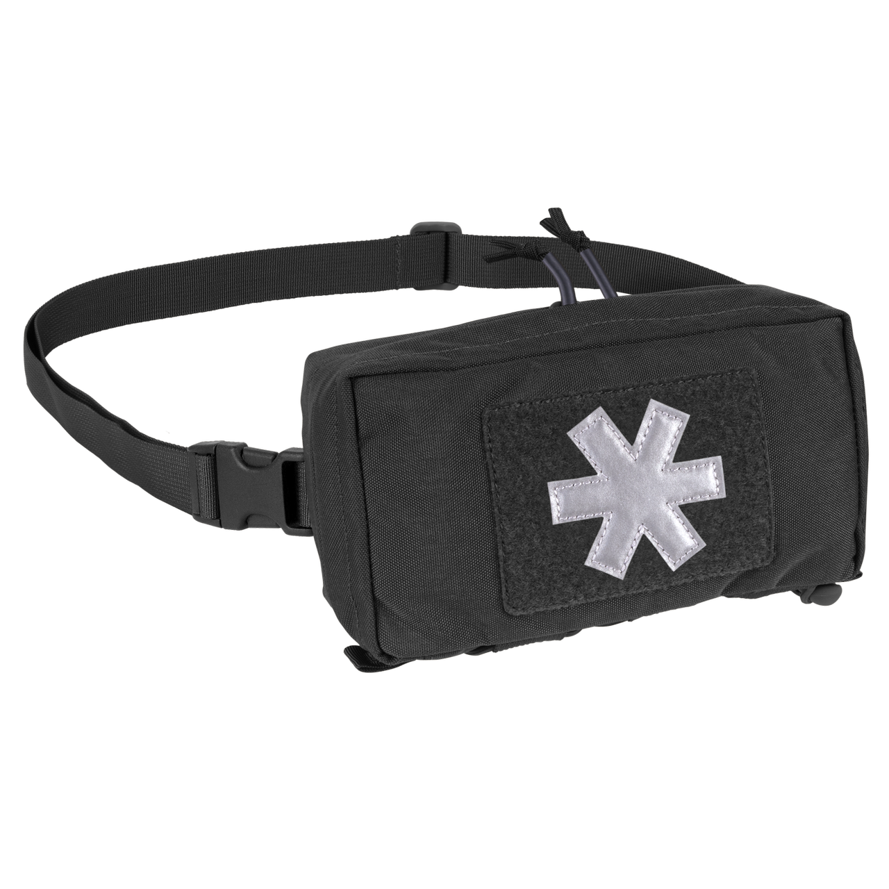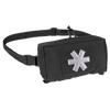 The pouch is accessed via a two-way zipper. Inside there is a velcro panel for mounting the Med Insert, two elastic ribbon loops, two Paracord loops, and a mesh pocket with an elastic drawstring. The pouch is available in several colors, has a velcro panel with a reflective paramedic cross embroidered, a detachable hip belt, and in the bottom part, three ribbons and an elastic drawstring. It is MOLLE/PALS-compatible.