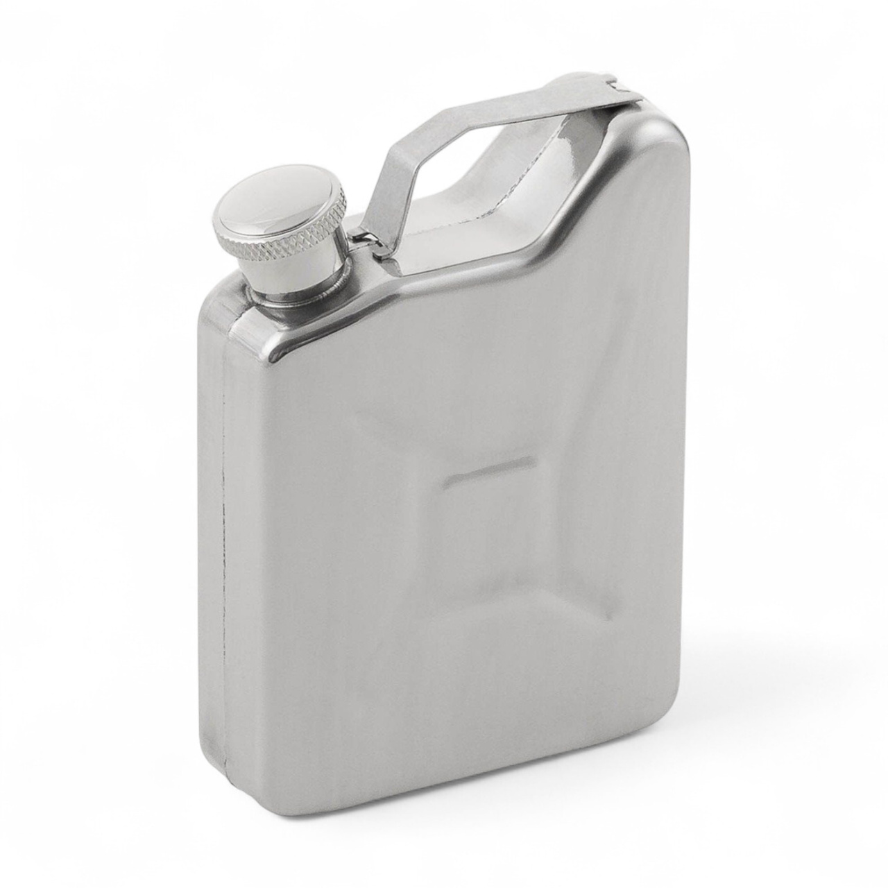 Canister-style flask made of stainless steel, with decorative Woodland camouflage coating. It has a screw cap and locking system, equipped with a handle for easy transport. Ideal for hiking, camping, or as a collector's item/military style.