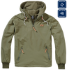 Brandit Windbreaker is lightweight and weatherproof, Anorak type jacket. Thanks to its durable and waterproof nylon and polar lining, the jacket provides good comfort during light rain or cold in the transitional seasons. It has a fleece lined hood, a short zipper at the front for easy dressing, two hand pockets and one large kangaroo pocket.
