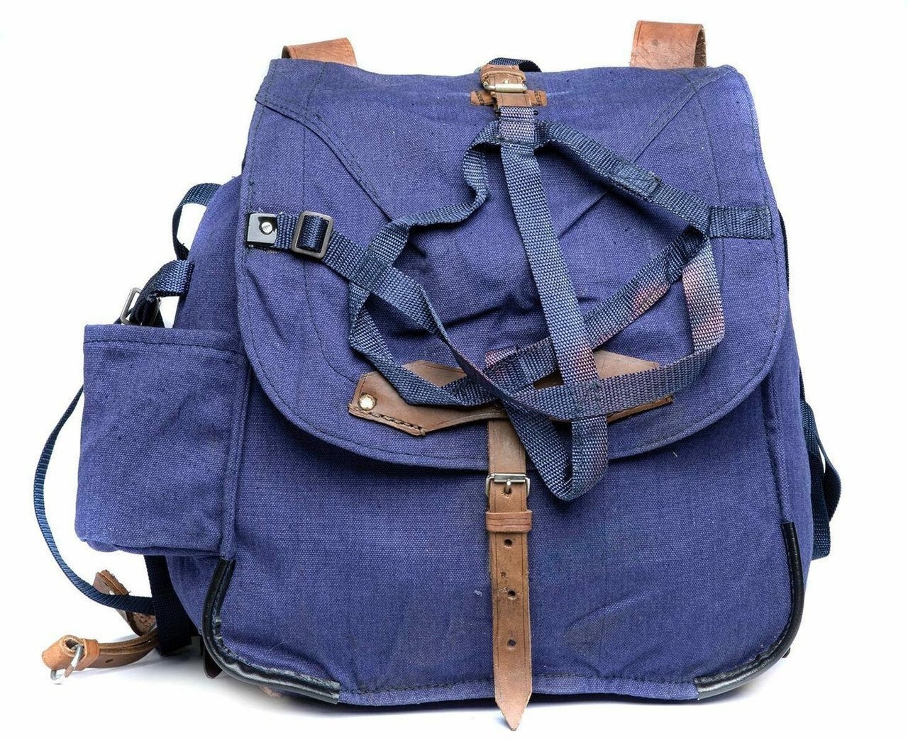 This genuine like new military backpack is made from sturdy heavy duty canvas in army green shade. The leather shoulder straps are adjustable and wider on the shoulder for comfortable wearing. The bag is quite big and can hold a lot of your stuff in it, it also has a leather belt and a fabric pocket on one side where you can carry a big water bottle, a tripod or a paper storage tube for example. It closes with a cord on the inside and fastens with a leather strap with metallic buckle on the outside. It has a lot of small leather loops all over, on this loops the military equipment like helmet and tent were attached.