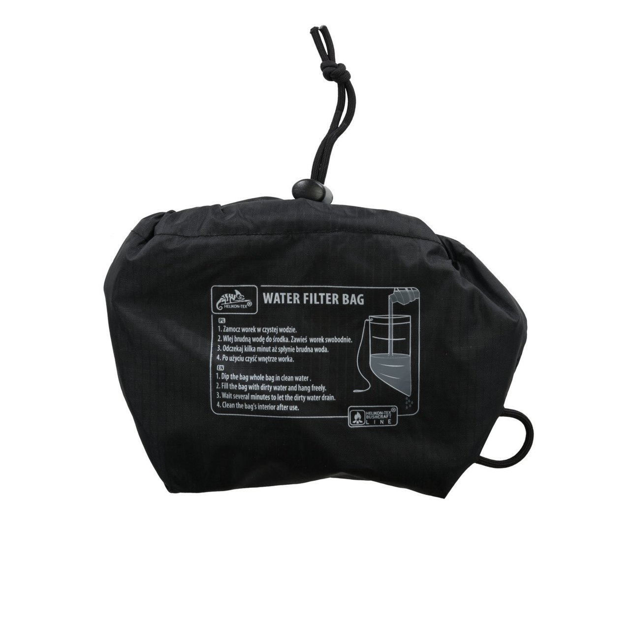 The Water Filter Bag allows to initially prepare water for consumption. Based on a design used by the British Army during World War II, this filter has been fitted with an integral carrying bag and a string for attaching it to a branch. The string has a pin, so you dont have to tie it. This significantly speeds up the use of the filter in the field. The filter cleans the water from mechanical impurities. After filtration, it is enough to use chemical tablets or boil water.