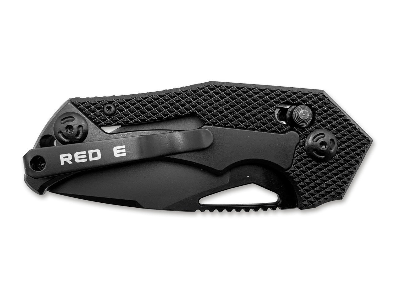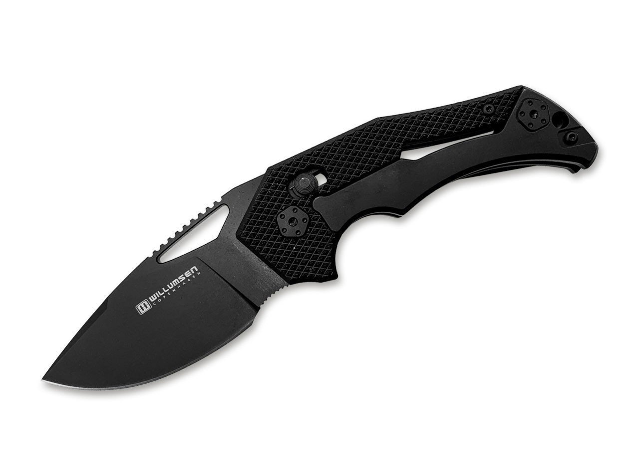 The compact Willumsen Red E Midnight sees itself as a problem solver for everyday cutting work. Its black D2 blade opens with a thumb hole and locks with the clever Axis Lock. The non-slip handle is made of a material mix of G10 and stainless steel. With lanyard hole and clip (tip-up / R)