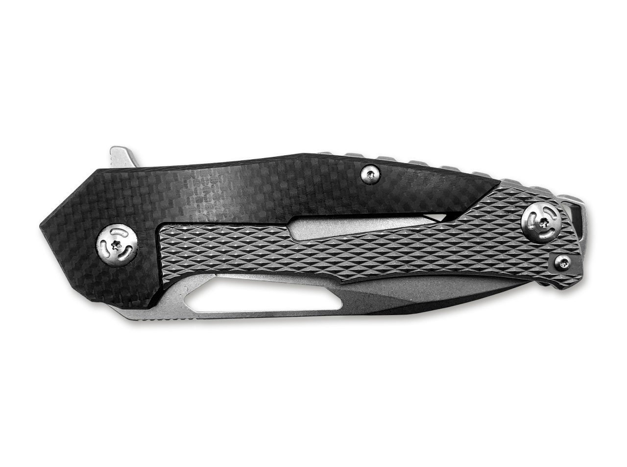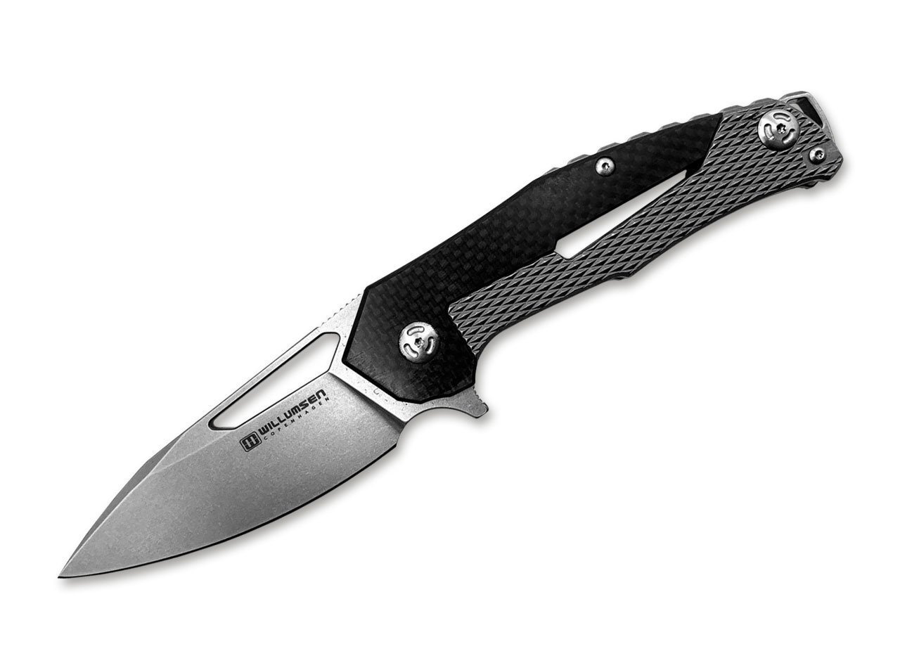 The Willumsen Chibs Stone Black is ready for the next adventure. Its sleek, tactical design is perfect for cutting rough materials, and its mirrored handle gives the knife its unique look. The D2 blade opens with a flipper and locks with the secure frame lock. The handle made of titanium and carbon fiber is partially textured and is therefore safe in the hand. With lanyard hole and clip (tip-up / r).