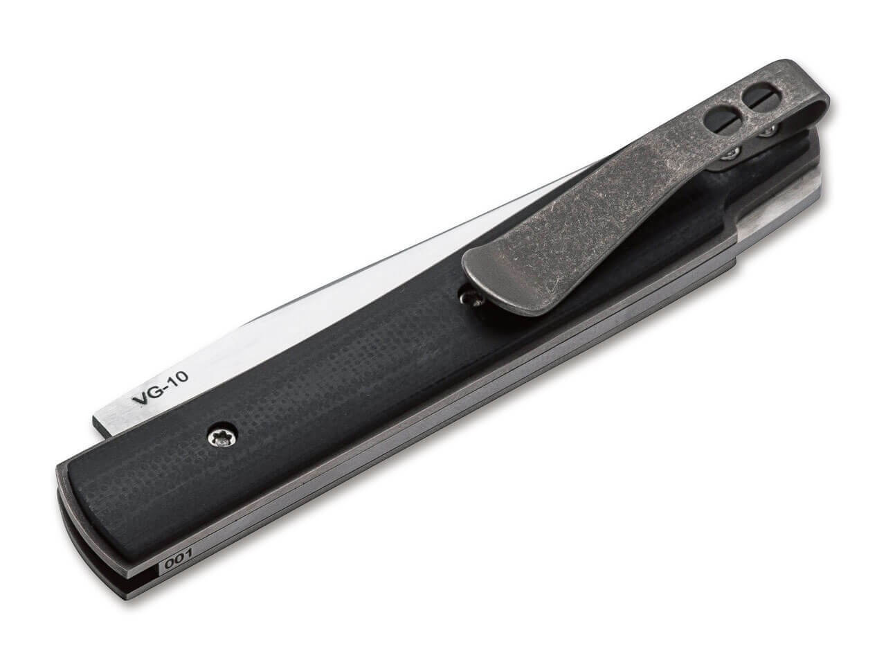 The smallest version of the Boker Plus Urban Trapper by Brad Zinker is now available with an additional locking mechanism thanks to the new patented wire hanger backlock. Due to the space-saving wire hanger, no additional upper spring is needed any more, which gives the blade considerably more space in the handle. The blade made of VG-10 with a fine hairline finish is equipped with a nail nick for two-handed operation. The noble handle scales made of selected cocobolo wood emphasise the noble character of this extremely light gentleman's knife. With deep carry clip (tip-up/r) and a high-quality nylon case.