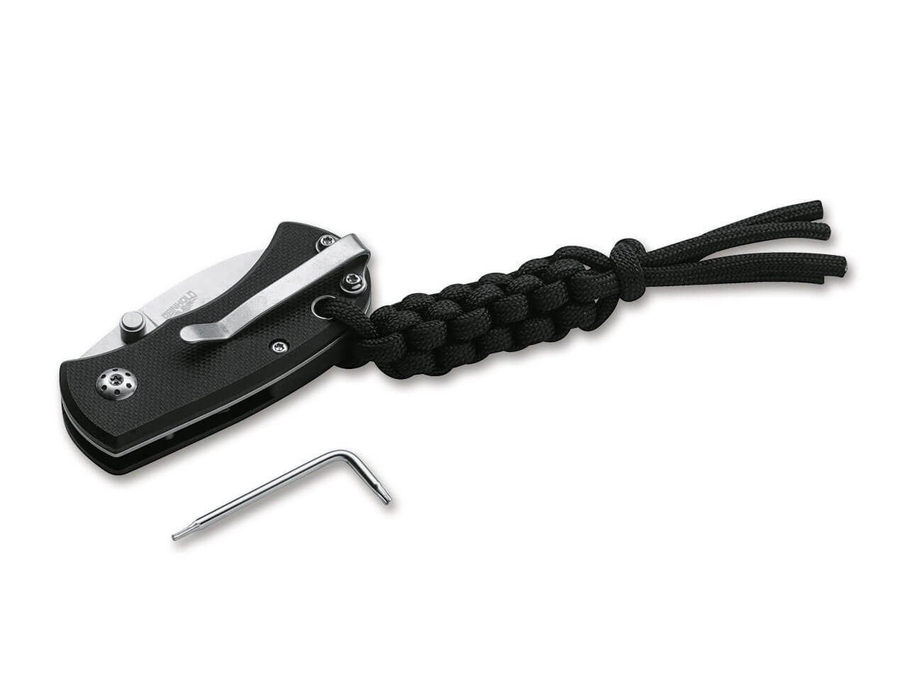 The extremely compact Boker Plus Rockhopper by Michael Reinhold surprises as a practical two-finger knife with excellent ergonomics and an extremely comfortable hand position, which is further improved by the black lanyard. It is equipped with a short blade made of D2, which is opened by a removable thumb stud on both sides and locked in place by a stable stainless steel linerlock in the textured G10 handle. The decorative blade axle screw is clearly curved. With reinforced lanyard hole, deep carry clip (tip-up/r) and high-quality nylon case for storage.