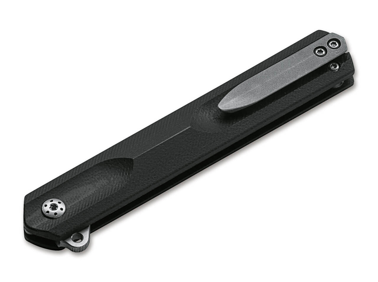 The remarkably slim Boker Plus Kyoto is a modern, lightweight gentleman's knife with three-dimensionally milled handle scales made of textured G10. Without appearing martial, the straight-line, symmetrical design is slightly reminiscent of a traditional stiletto. The D2 blade, ground on one side with a fine hairline finish, has an elegant hollow grinding. It is opened by a flipper on ball bearings and locked by a linerlock. The decorative titanium clip (tip-up/r) is milled from solid titanium and has a stonewash finish. It integrates perfectly into the milled recess of the rear handle scale and thus hardly applies any pressure. With high-quality nylon case for storage.