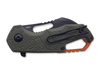 The short Hawkbill blade is made of N690 and has a robust stonewash finish. It is opened using the flipper or the elongated thumb opening and a liner locksecured. The non-slip gray plastic handle has a textured surface and thanks to the ergonomic recessed grips, it sits securely in the hand even when wet. With convertible wire clip (tip-up / lr).