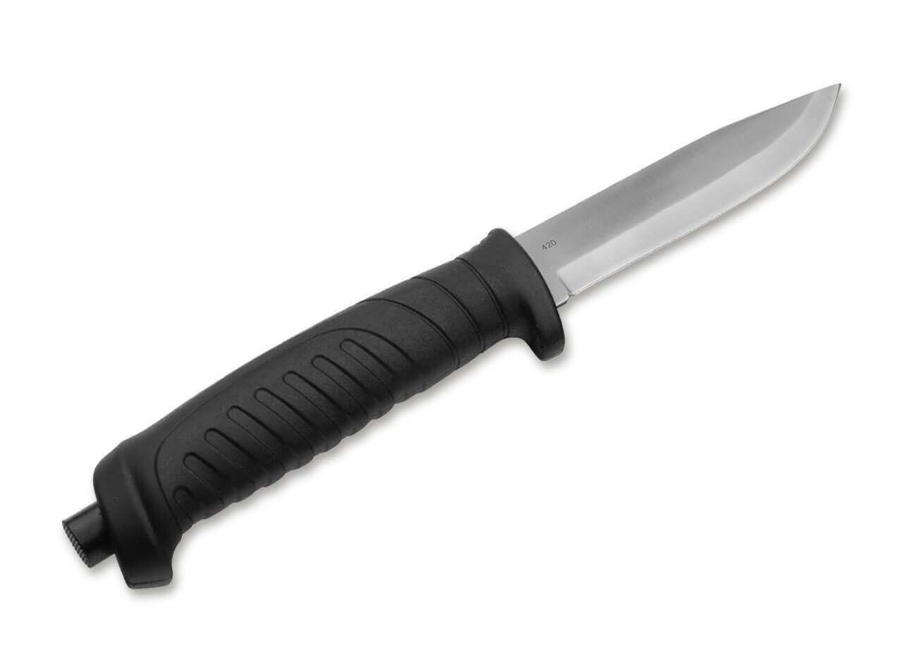 The Magnum Knivgar is an uncompromising and modern implementation of the knives of the Scandinavian Sami, which have been tried and tested for thousands of years in the harsh Nordic wilderness. It is a universal workhorse for hard and ruthless use in survival training, hunting, fishing, crafts or any other conceivable application. The blade is made of 420A stainless steel and is breakproof and easy to sharpen even under field conditions with simple means. The indestructible black plastic handle is inseparably connected to the blade by injection moulding, as is the practical hammer and chisel surface on the pommel. These extend the range of applications of the knife by numerous practical tasks. The one-piece sheath made of weatherproof plastic is equipped with a belt loop and a drainage. This allows all parts of the knife to be cleaned easily and thoroughly, especially after hunting.