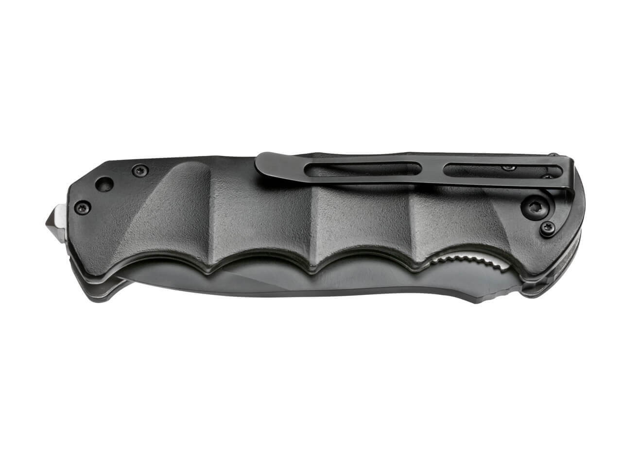The Magnum Black Spear II is an impressive tactical knife that is ready for any mission, no matter how challenging. The modified 440A stainless steel spearpoint blade features a slight recurved line for effectively performing even the most demanding cutting tasks. The Linerlock provides the required security. The pronounced finger grooves of the black aluminum handle always guarantee a high level of safety. With glass breaker, lanyard hole and pocket clip.