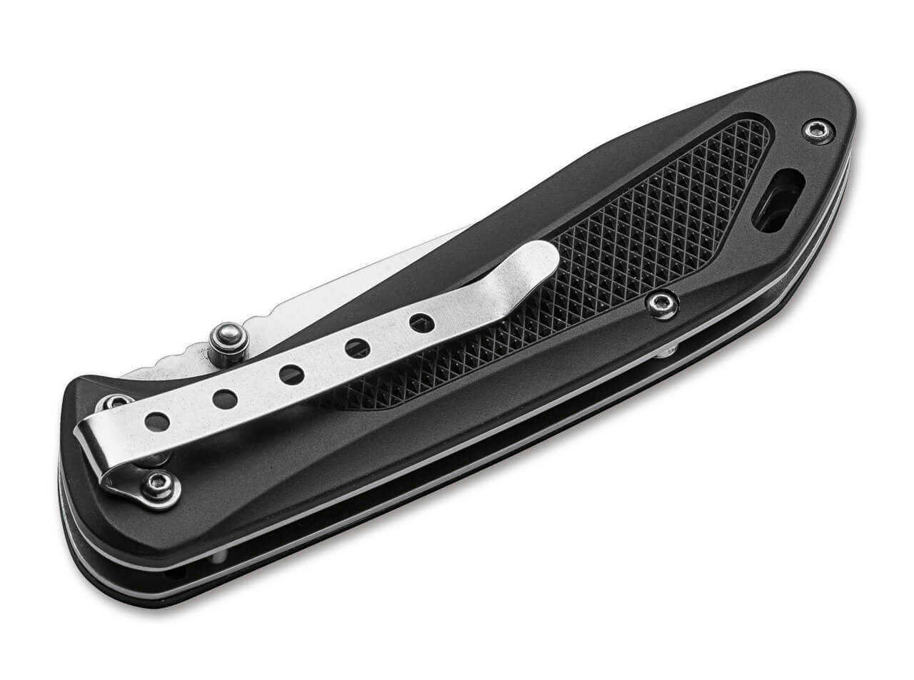 The Checkering Black is an understated variation in the Magnum Advance Series, lifting it to a new quality level. The elaborate checkering of the aluminum handle scales offers a secure grip and full functionality. The blade consists of stainless 440C with excellent edge retention. It opens with a thumbstud and is secured with a linerlock. It has a ridged spine and a lanyard hole and comes with a deep-carry clip (tip-up) and a handy belt sheath.