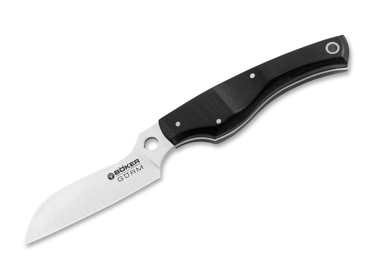 Designed by the renowned knifemaker Jesper Voxnaes from Denmark, the homeland of the Vikings, and handmade in the Boker Manufactory in Solingen, Germany, the home of high quality blades, the Gorm combines ageless virtues which make this knife series a real masterpiece of kitchen cutlery. The choice of materials is as extraordinary as the design. Equipped with stainless 440C steel with its high edge retention and a Rockwell hardness of 58-59° HRC. The characteristically shaped hole in the blade provides excellent control while you choke forward on the handle like the professional chefs do. From an ergonomic standpoint, the Gorm sets a new standard. The handle scales are made of milled canvas Micarta with the typical linen texture.