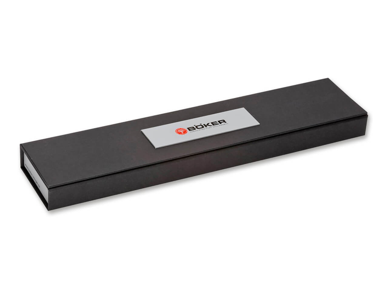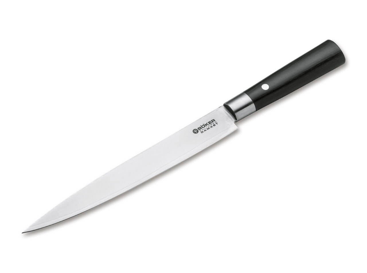 The Boker Damascus Black Kitchen Knife line combines traditionally Japanese handles made of black Plywood with razor-sharp blades made of stainless Damascus with 37 layers of steel, characterized by a beautiful grain. The extremely high-impact core of the Damascus blade consists of the high-performance VG-10 steel. The noticeable sharpness when cutting is breathtaking and makes cooking an experience. The Japanese design of the knife handle with the matted stainless steel clamps gives the line its special character.