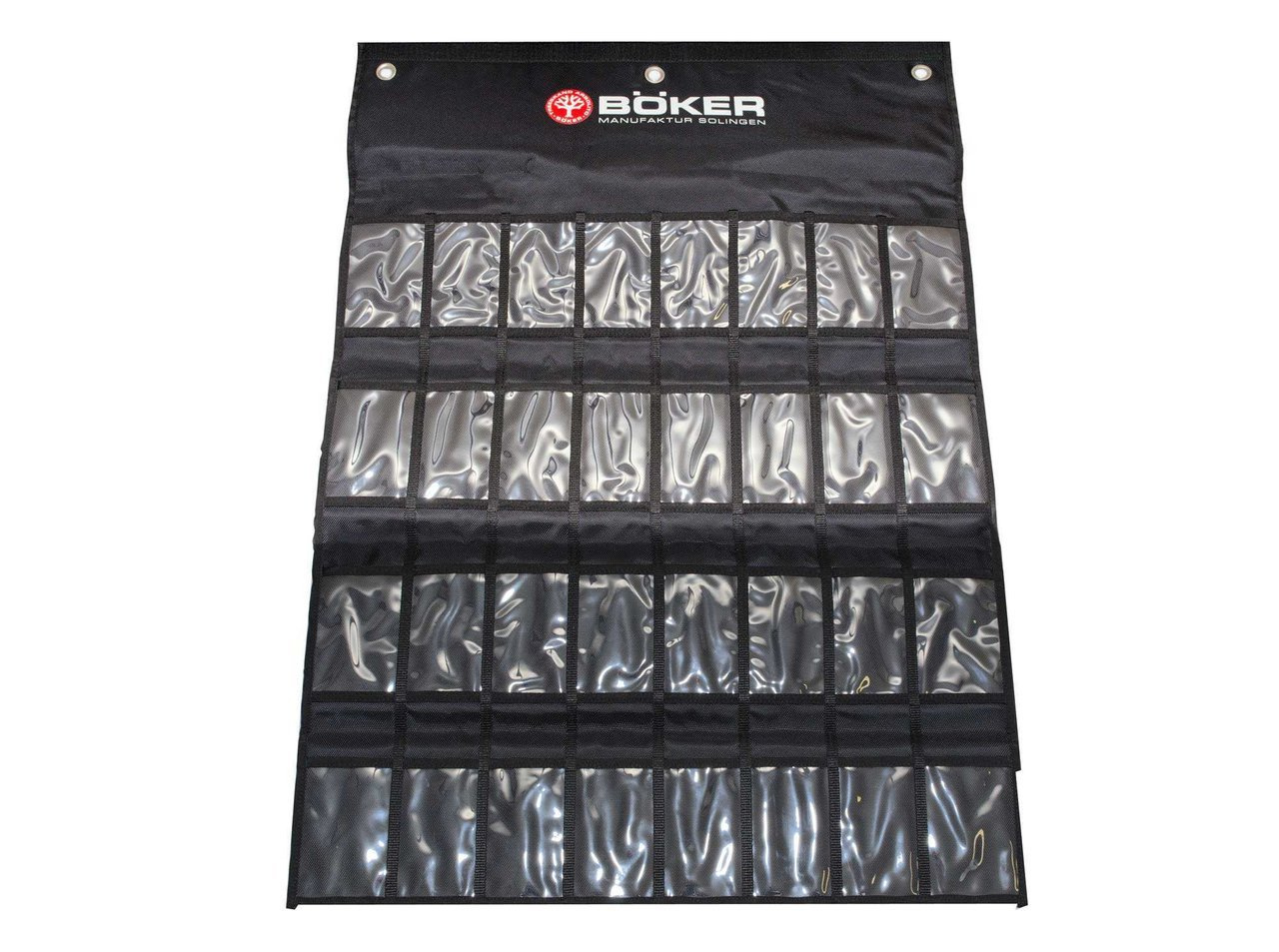 The Boker Knife Bag is ideal for the transport and presentation of up to 32 knives from a total length of up to 17 cm. Knives or accessories up to a width of approx. 7 cm fit into the transparent knife compartments. 4 rows can accommodate up to 8 knives. Velcro fasteners for secure closure as well as three rivets for hanging and presenting in the open state make this bag a practical, stable and safe companion for your knife selection. Measures closed: 63 cm x 18,5 cm. Length folded out approx. 86.5 cm.