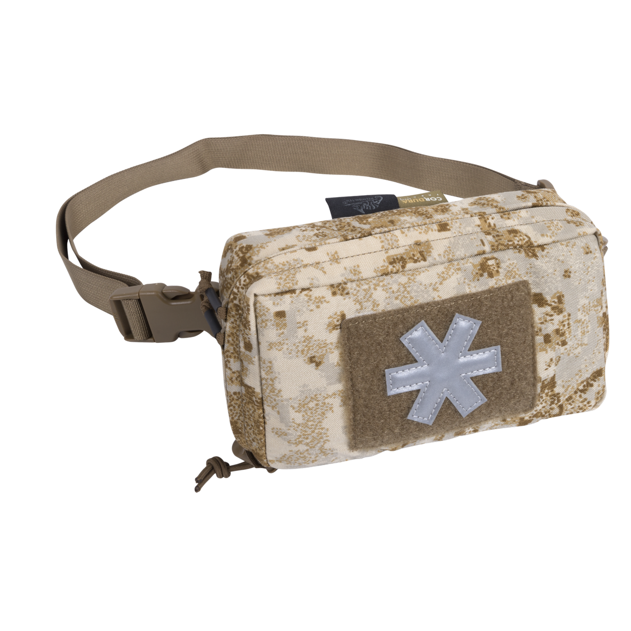 The pouch is accessed via a two-way zipper. Inside there is a velcro panel for mounting the Med Insert, two elastic ribbon loops, two Paracord loops, and a mesh pocket with an elastic drawstring. The pouch is available in several colors, has a velcro panel with a reflective paramedic cross embroidered, a detachable hip belt, and in the bottom part, three ribbons and an elastic drawstring. It is MOLLE/PALS-compatible.