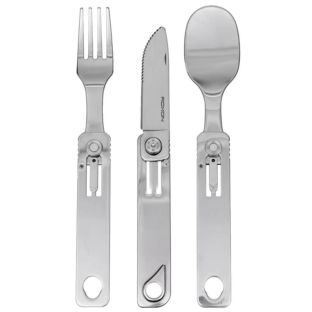 • High quality, foldable, 3-part cutlery set from Roxon® with spoon, fork, knife, and transport bag, lightweight and compact, is an ideal accessory for any outdoor adventure.
