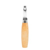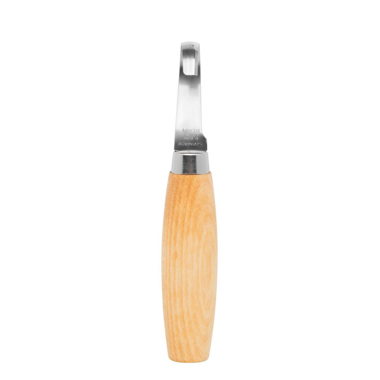 This knife has a single-edged stainless steel blade for left-hand use. The back of the knife is not sharp which gives you the possibility to use your right hand to push the blade with your fingers from the back. This blade has the smallest curve from the Morakniv® hook knives. They have optimized the blade to make it run smoothly over the inside of the spoon or bowl.