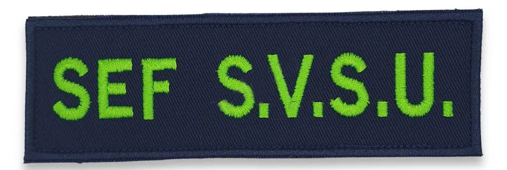 SVSU Chief badge made with 100% polyester Madeira Polyneon thread in vermilion colour on a navy blue backing with heat-sealed inlay is made of 65/35% cotton/polyester fabric.