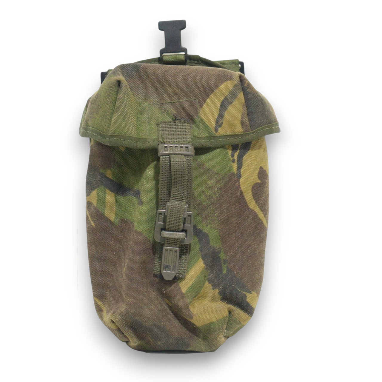 Utility pouch for hydration system, with DPM camouflage, equipped with webbing fasteners on the back for attachment to a belt or harness, made of durable material, suitable for use in tactical or outdoor conditions.