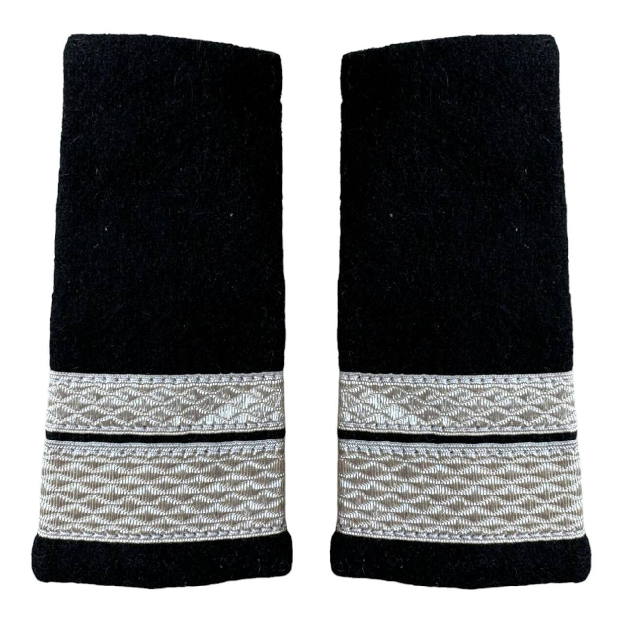 The military ranks are made in the form of a tubular sleeve with uneven ends, made on textile support of wool paspoal, embroidered with silver thread.