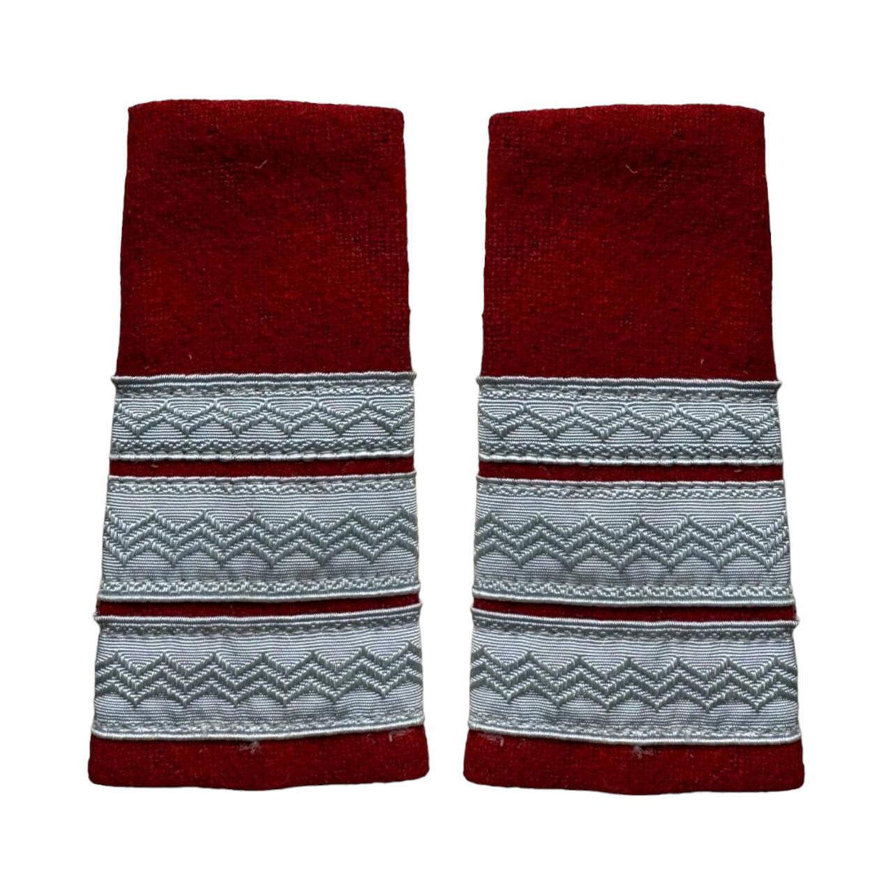 Military ranks are made in the form of a tubular sleeve with unequal ends, made on a textile backing of wool paspoal in the colour of the weapon, on which the rank markings are embroidered with metallic thread.