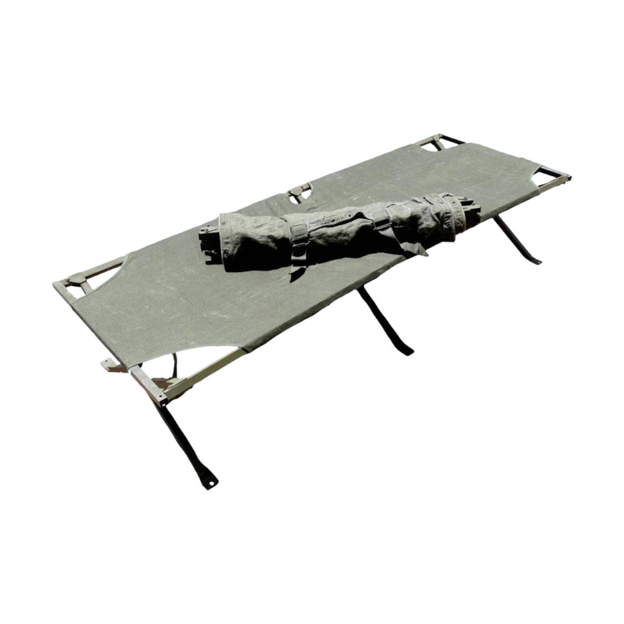 Folding steel frame bed popular with hunters, survivalists, and collectors.