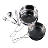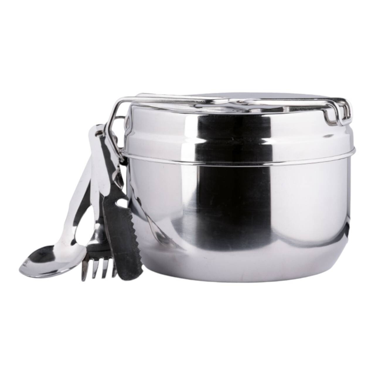 Camping and bivouac cookware set in stainless steel, compact and functional, it consists of 2 saucepans and a lid that can be used as a saucer, this bivouac cookware is compact and functional, it comes with a set of 3 stainless steel cutlery.