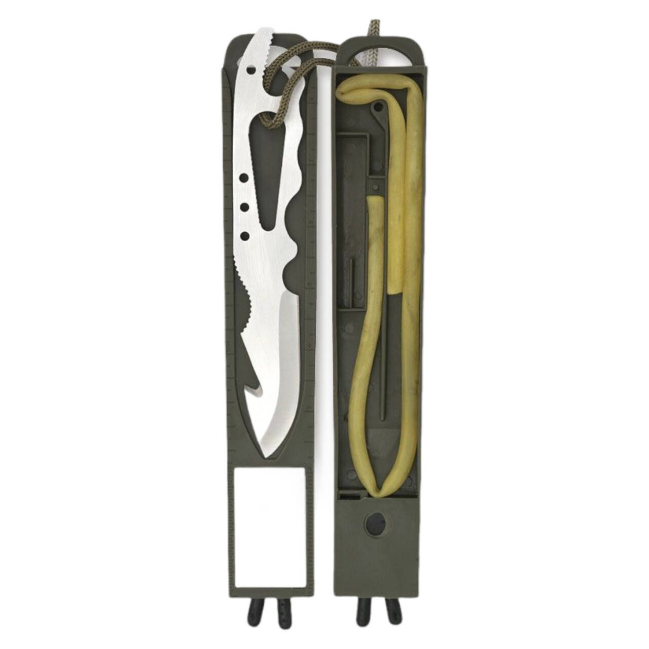 The K25 Thunder I OD Green is a survival knife with an emergency survival kit inserted into the handle, which is sealed with a screw cap and integrated compass. The 8Cr13MoV blade is titanium-coated. It has a distinctive two-tone finish and a serrated edge. It has a distinctive two-tone finish and a backsaw. The ambidextrous hand guard prevents slippage in the blade, while the textured green plastic handle features an optimized grip. Every imaginable detail has been considered in the multi-purpose sheath, which can accommodate emergency equipment and be used for a wide range of non-knife purposes. The Thunder I comes with a versatile secondary knife with additional functions that can also be used as a harpoon.