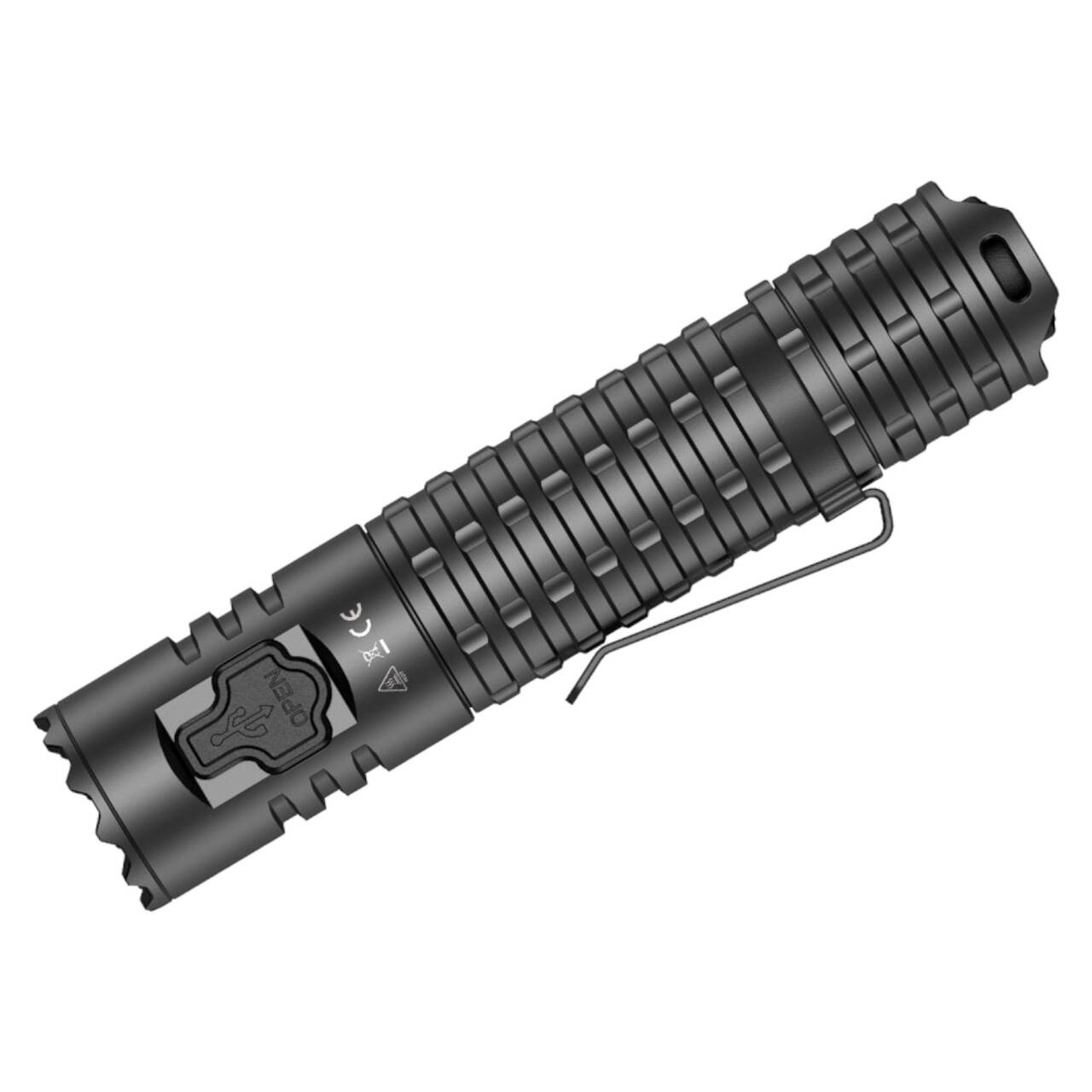 The flashlight has a built-in USB-C connector protected with a rubber cap that allows direct charging of the inserted 18650 battery. It takes approximately 4 hours to fully charge the flashlight.