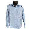 Men's long-sleeved blouse shirt with long sleeves and band at the termination is made of blue poplin fabric. Two pockets with flap and flap flap are applied on the upper chest. The upper back has a double placket and epaulettes on the shoulders. The shirt has a drawstring at the hem which is adjusted with buttons and button fastenings. The left sleeve is fastened with the specific badge.