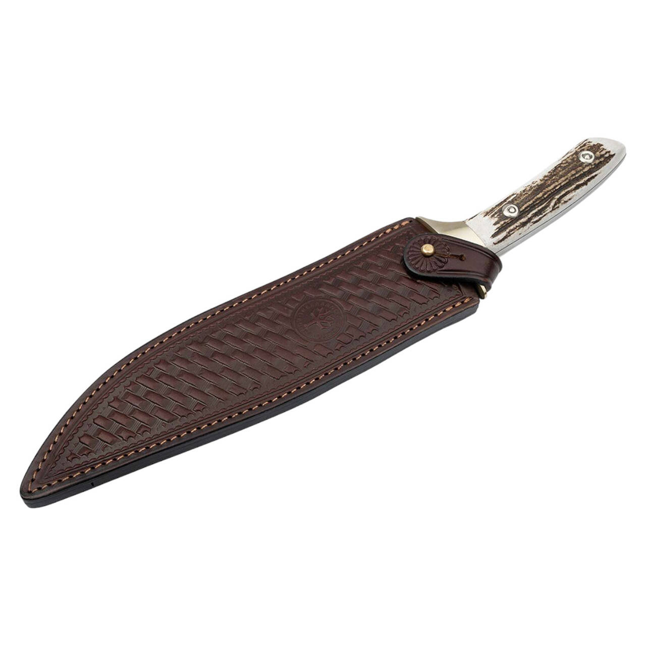 We close a line in our range with the El Gigante with deer antler scales. The extremely robust bowie knife in full tang construction has already inspired many outdoor enthusiasts and hunters. With its selected stag antler scales, it is now perfectly equipped for hunting and is convincing both as a hunting knife on foot and as an effective intercepting knife for wild boar or the more powerful stag. The blade is made of ACX390 steel and has a stainless steel filing element. It comes with a high-quality leather sheath. Height 36.8 cm. Blade 23,5 cm. Thickness 6,4 mm. Weight 476 g.