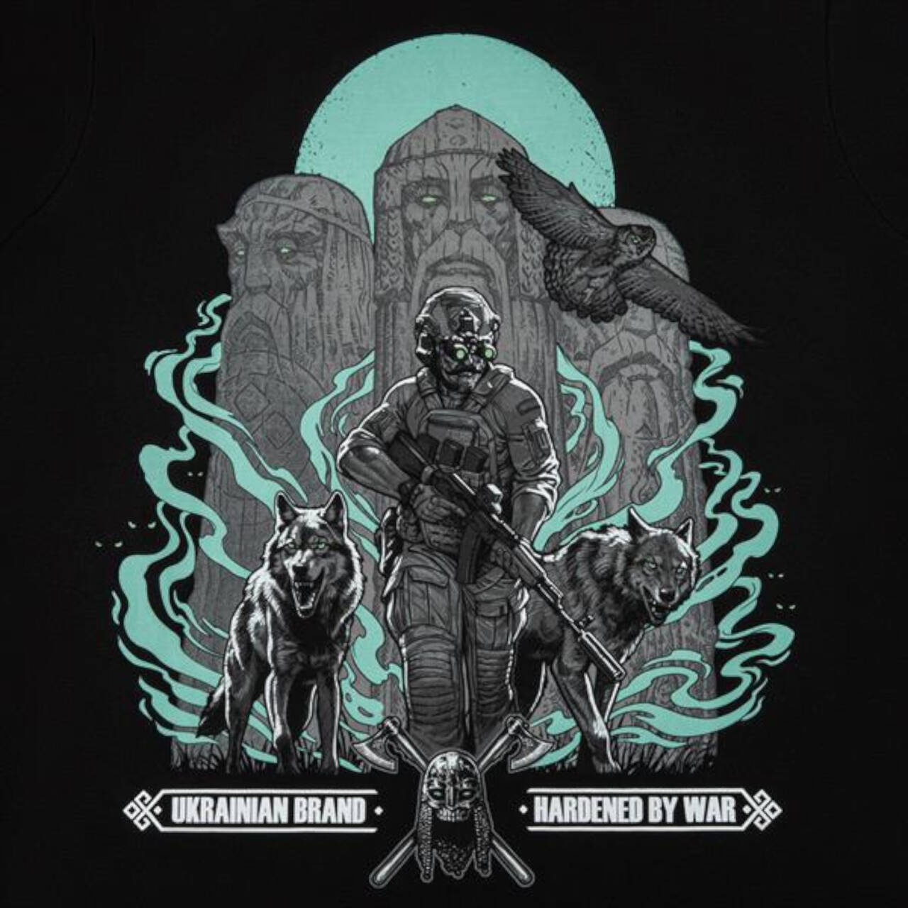 The print depicts a modern military man. He is a symbol of courage and bravery of the Armed Forces of Ukraine. Next to him are his faithful brothers: the owl, which has long been considered the personification of wisdom, and today - the symbol of military intelligence, and the wolf - the embodiment of loyalty, strength and courage, as well as the symbol of the SSO(Special Operations Forces). Together, they are a symbol of courageous and steadfast warriors who day by day, side by side, fight for our right to independence. Behind them are depicted the figures of ancient gods, personifying the emergence of the Ukrainian military prowess from ancient times.