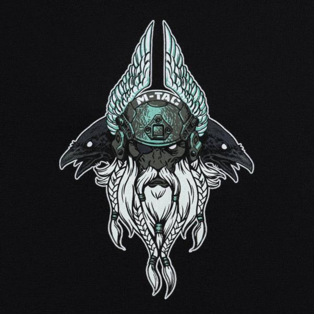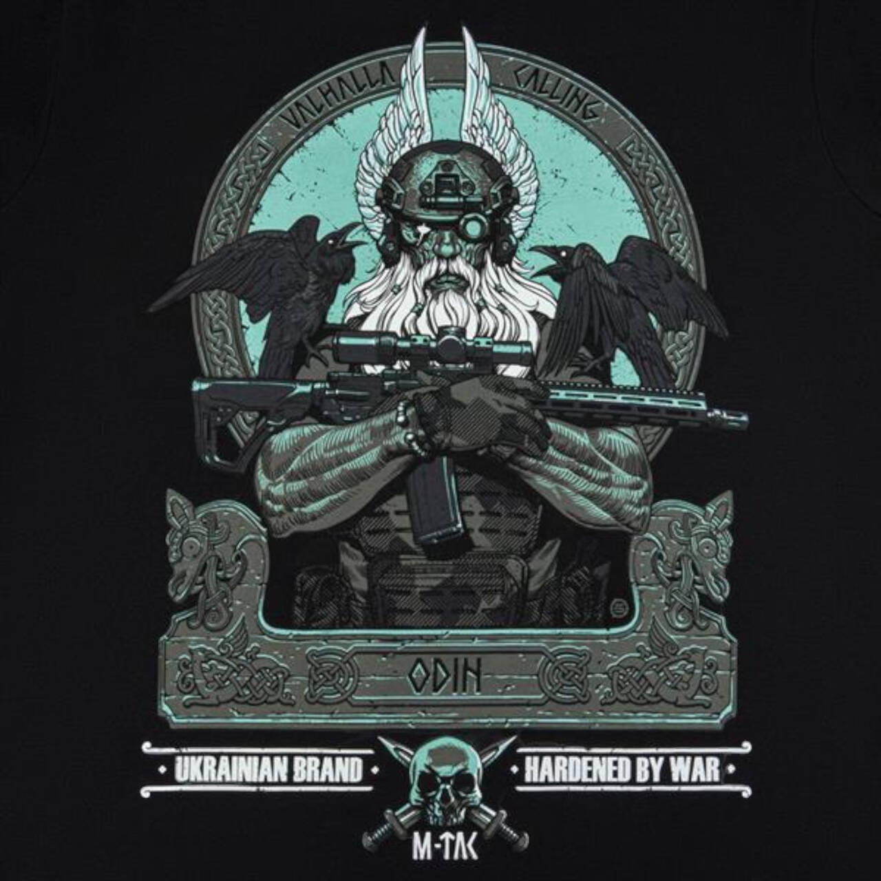 The print shows a determined Odin who has traded his traditional spear (Gungnir) for an AR-15 rifle. Dressed in modern combat gear and a NVD helmet, he is ready to lead his warriors into the final battle. On Odin's shoulders sit his faithful companions - the ravens Hugin (thoughts) and Munin (memory), who fly around the 9 worlds every day and report to the supreme god about everything that has taken place.