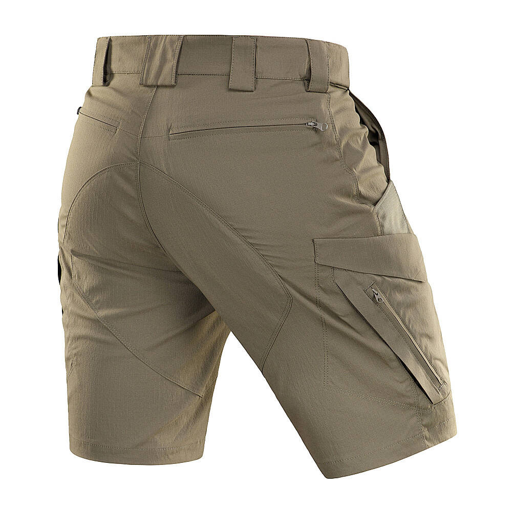 The M-Tac Aggressor Summer Flex shorts can be used for the training, shooting, work as well as for the business trips or walks. Made from lightweight plain Flex Rip-Stop fabric: 93% nylon, 7% elastane. This material has good permeability, provides free air circulation, and extremely sun-resistant. The shorts have an elastic "tunnel" waist with a comfortable fit adjustment, designed to wear with a belt up to 5.5 cm wide. In the front below the waist, two D-rings are sewn for attaching various equipment. Quality hardware by the YKK company. The shorts have 7 functional pockets for convenient storage of essentials. Wide trouser pockets are reinforced with special inserts and allow you to attach a clip for a folding knife, tactical pen, or flashlight. Side cargo pockets are equipped with an asymmetric velcro flap, which reliably protects the contents from falling out. If necessary, the expansion fold allows increasing the internal volume of the pocket for carrying bulky items.The additional zippered pocket is perfect for a mobile phone. A pair of back pockets also have a zip closure to keep your belongings secure.Thanks to the thoughtful cut, the shorts don't restrict freedom of movement: they are comfortable in them to jump, run, bend, squat, and move over rough terrain. They can easily perform tasks of both tactical and casual wear.