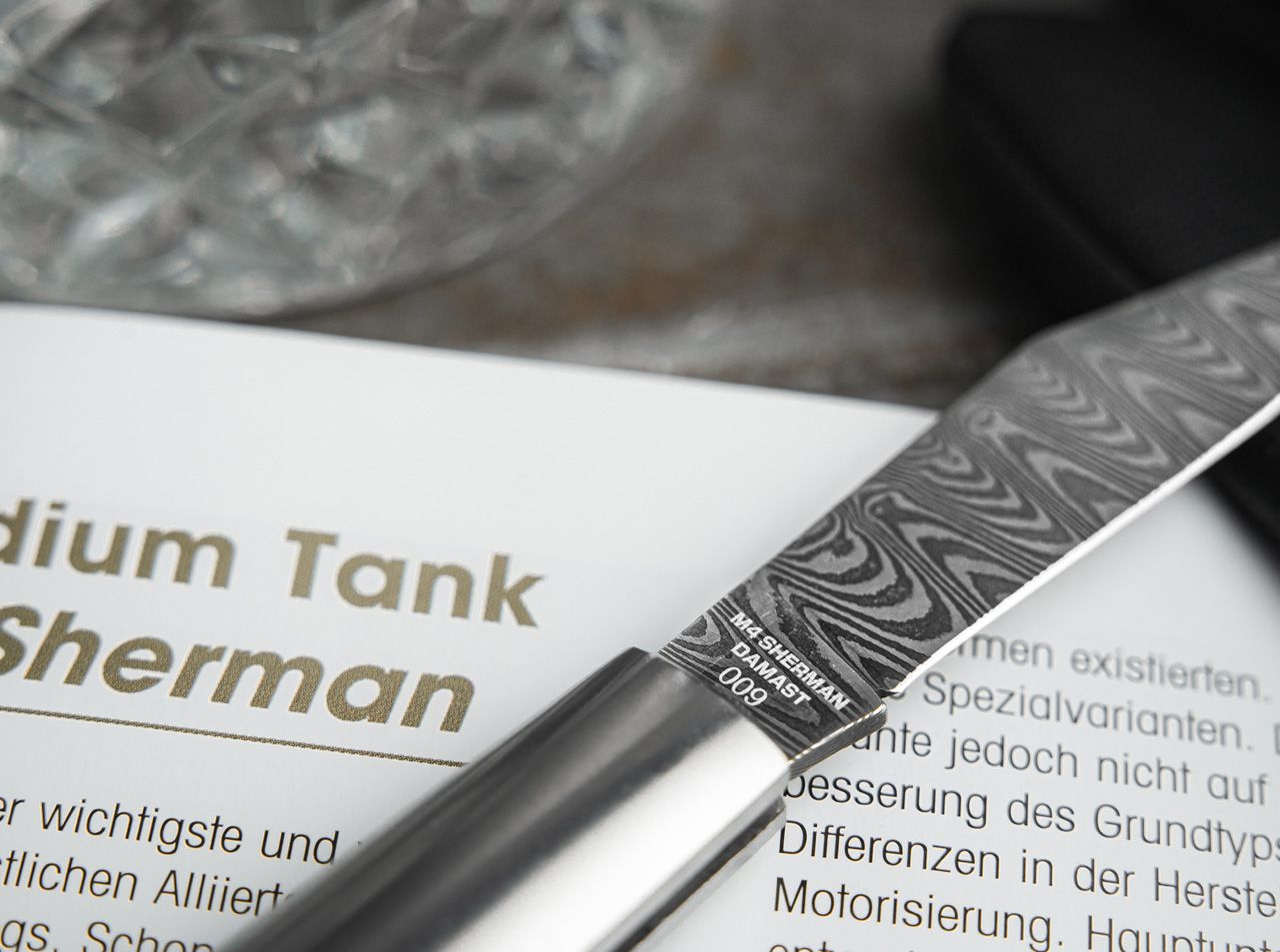 The Boker Barlow M4 Sherman-Damascus is supplied with a unique Damascus blade forged from various materials from the production of M4 Sherman tanks previously restored by the museum. The unique 80-layer Damascus is hand forged for us by Chad Nichols in the customized Ladder pattern and is reminiscent of the tank marks left in the ground by the heavy tracks of the M4 Sherman. The integrally constructed Barlow is supplied with burlap micarta handle scales that are colored to evoke the authentic camouflage finish of the U.S. Army and Marine Corps. The stainless steel handles are CNC-milled from the solid and also form the characteristic bolsters and are ground to a matt finish by hand. Supplied with a high-quality felt case for storage, a certificate of authenticity and an individual serial number. Handmade in the Boker Knife Manufactory in Solingen.