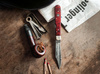 The blanks are classically made of brass, while the bolsters are made of nickel silver. The blade made of hand-forged stainless Damascus by Chad Nichols from Mississippi in the USA convinces with 200 layers and the pattern Scrambled. It locks securely with a backlock and harmonizes beautifully with the finely grained burl birch scales, stained in the noble shade of amboina red. Handcrafted in the Boker Manufactory in Solingen and strictly limited to 999 knives worldwide. Delivered with the reissued historical Boker tree emblem, certificate and noble floating display.