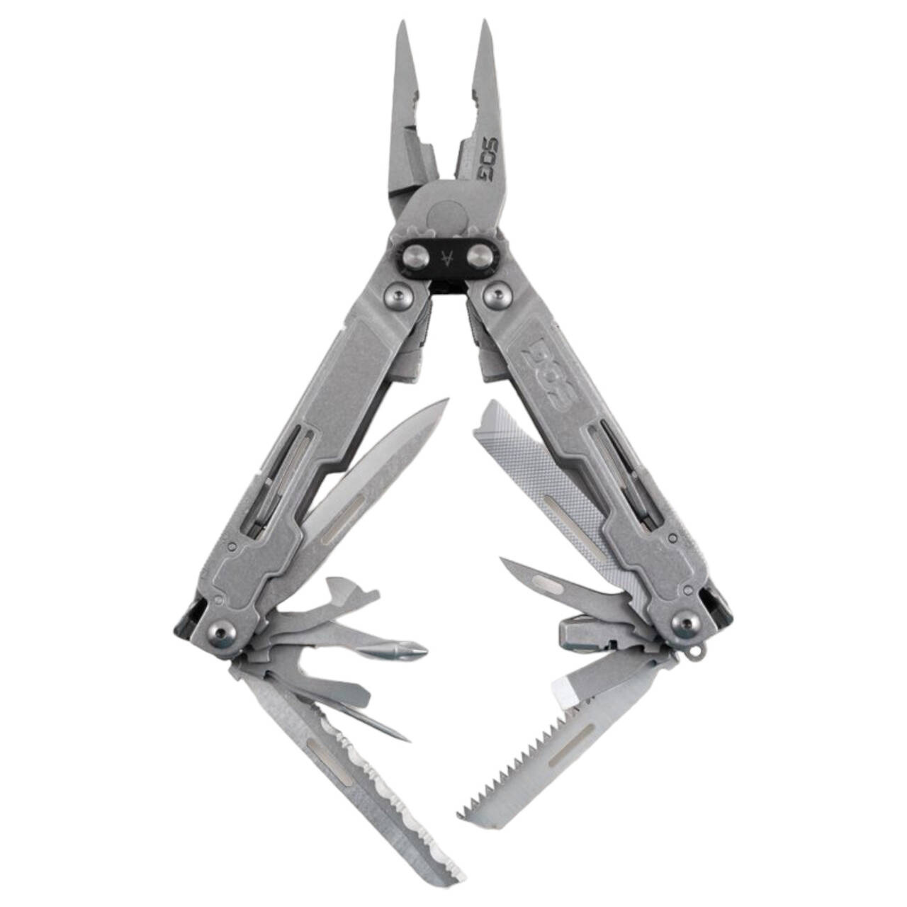 With 20 practical functions, the SOG PowerAccess Deluxe is the best choice if you are looking for the ultimate workhorse. It offers a solid steel structure with an indestructible stonewash finish and reliable locking mechanisms for each function. A tool with no holds barred. The PowerAccess Deluxe has almost all the tools of the current SOG product portfolio. The pliers head with a powerful gear rim has flat front jaws to work as needle-nosed pliers, then the gripper for working with hex screws, pipes, and cap nuts, and lastly hard and soft wire cutters. The versatile tool also includes a medium-tip straight-edged blade (7 cm), a sheepsfoot blade with a serrated edge (7 cm), wood saw (7 cm), 3-sided file, Phillips screwdriver # 1, awl, jewelry driver flat screwdriver (small and medium), hex bit driver (1/4), chisel, ruler (inch/cm), can and bottle opener and lanyard hole. The tool also comes with a Cordura belt case that can hold the tool and bits.