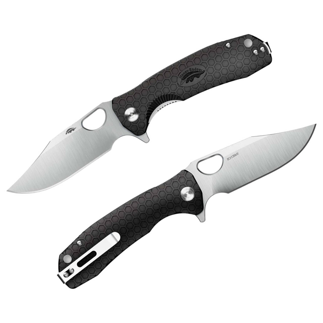 The Honey Badger Clippoint Large impresses in particular with its robust construction. The 8Cr13MoV clippoint blade is extremely strong and easy to sharpen. The thick shaft and wide profile ensure stability and easy cutting. The high-quality ball bearing enables smooth opening and closing of the satinised blade, which can be opened with a flipper or thumb opening and locked with a liner lock. The characteristic honeycomb pattern of the textured, black FRN handle scales ensures a secure grip with a lanyard hole and reversible deep-carry clip (tip-up).