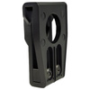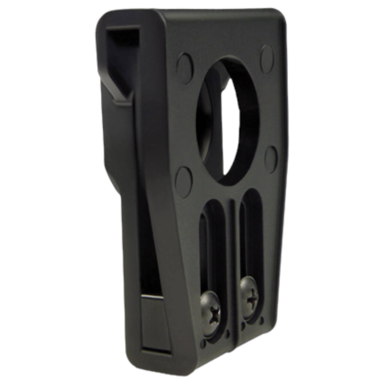 This type of holder is equipped with a UBC-03 belt clamp. The holder is normally inserted by sliding the belt through the hole in the clip. The clamp can be adjusted to the width of the belt by means of the adjustable two-bolt stop.