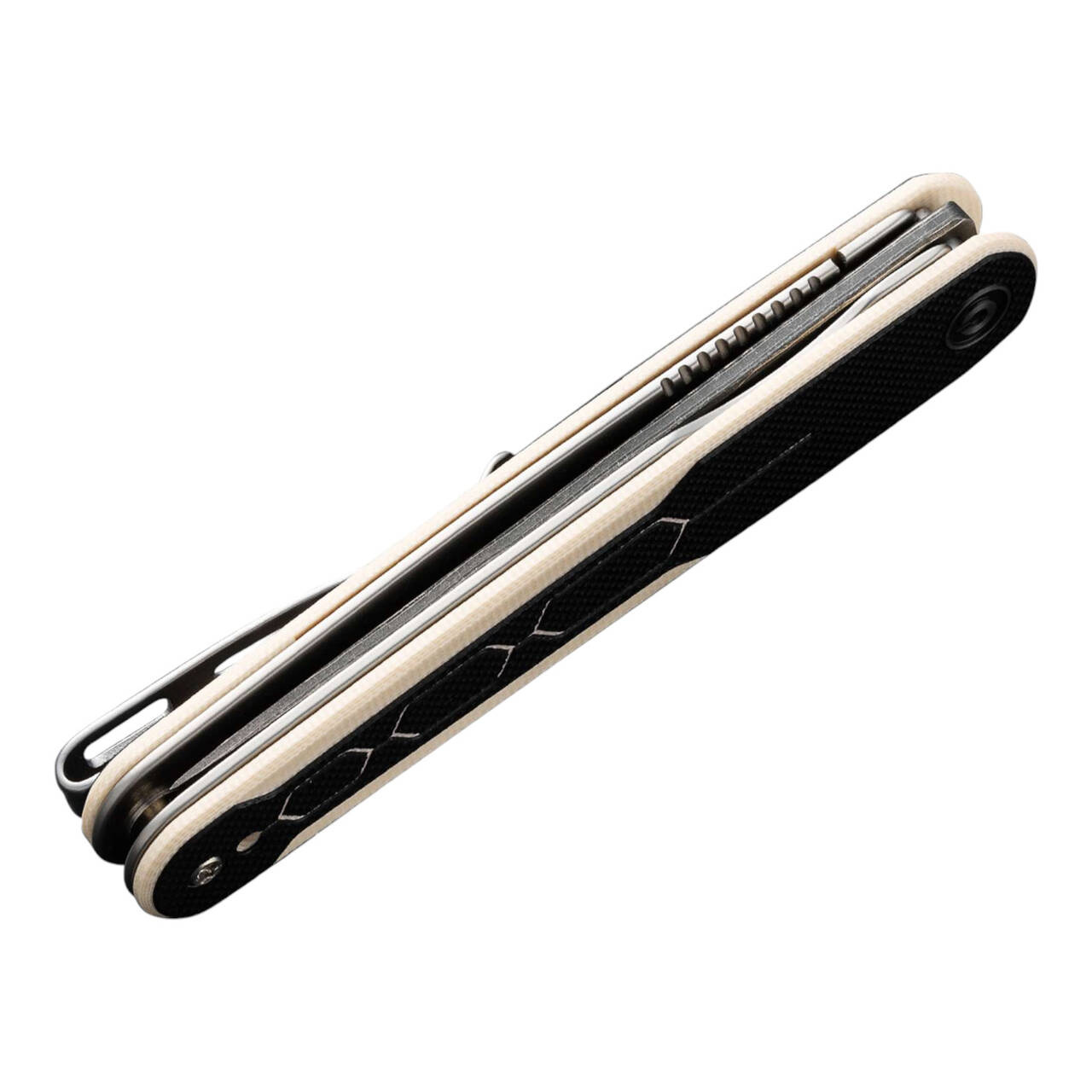 CIVIVI presents the KwaiQ, inspired by a Japanese-style gentleman's knife. The design by Rafal Brzeski combines elegance and a slimline look with absolute practicality. The reason for this is the ball-bearing tanto blade made of fine Damascus and the textured handle made of milled G10, which comes in a tasteful mix of creamy white and black. The pocket knife is opened using the discreet flipper, while the liner lock reliably holds the blade in place. Precise cuts, maximum control and timeless elegance, or in other words: KwaiQ. With reversible tip-up clip.