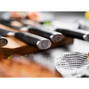 The square block of solid smoked oak wood, equipped with knives, features an integrated insert with fine plastic bristles. Each side is fitted with magnets. The set includes a paring knife, a small chef's knife, a bread knife, and a chef's knife, all easily accessible at any time. Purchasing the set offers a 10% price advantage compared to buying each knife individually.