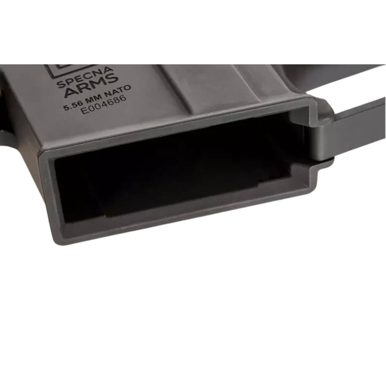 The replica’s box includes two S-MAG mid-cap magazines, each with a 125-round capacity. The S-MAG is an exclusive polymer magazine designed by Specna Arms. What stands out is the distinctive texture made up of Specna Arms logos. The S-MAG ensures reliable BB feeding, even at a high rate of fire.
