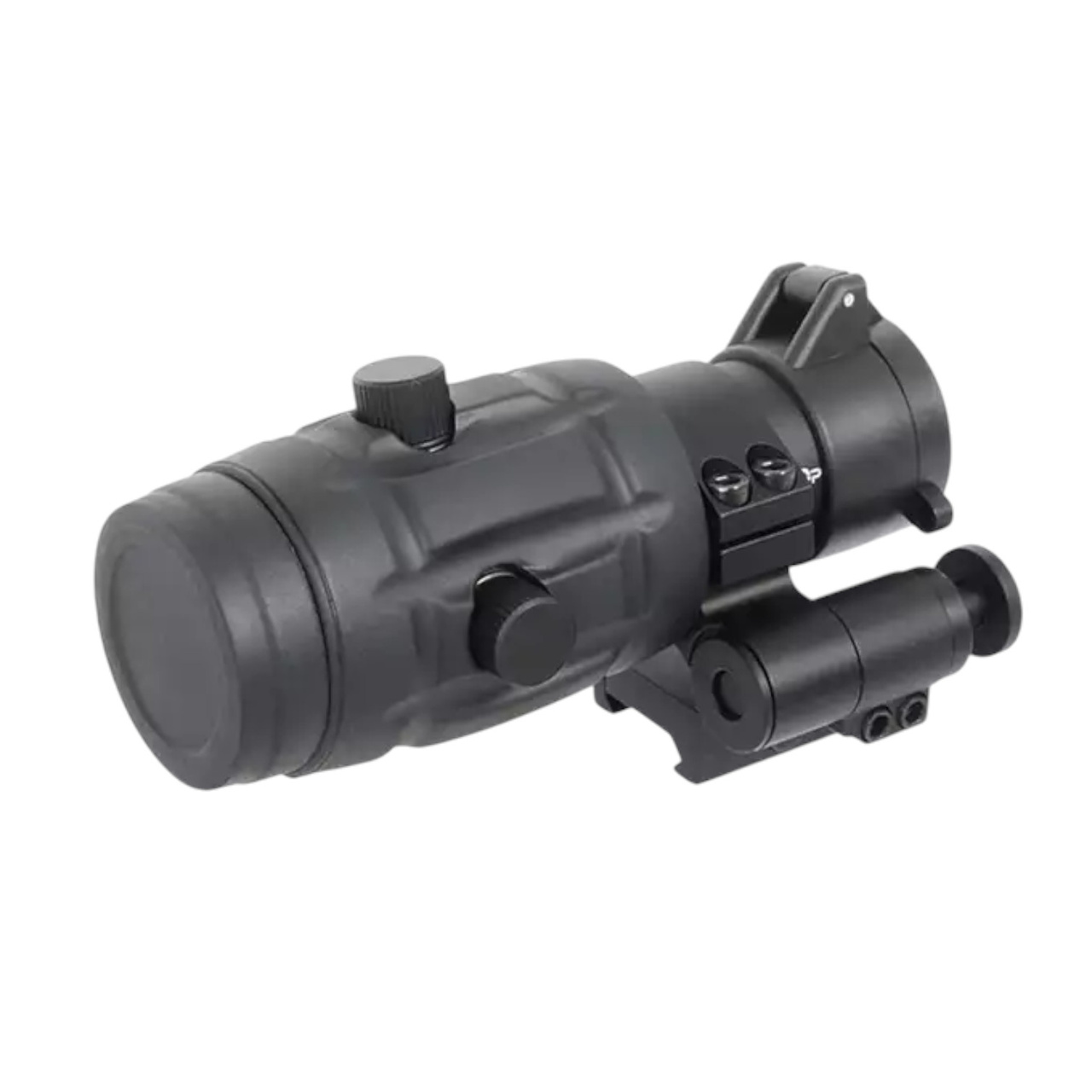 The Magnifier is equipped with a quick RIS rail mounting system. The clamping force on the rail is adjusted by a nut located on the bottom of the assembly.