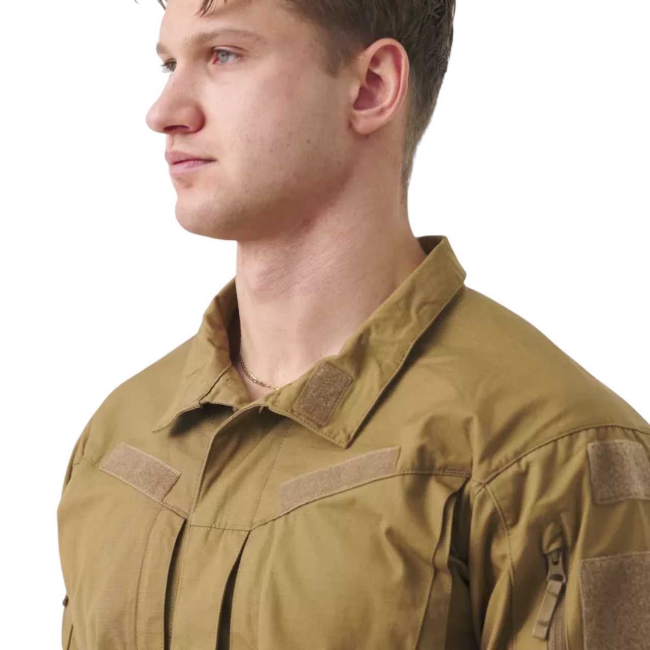 MBDU Shirt is part of our advanced field uniform, the Modern Battle Dress Uniform. This uniform was made from carefully selected high-quality fabrics to offer not only outstanding durability but also the freedom of movement, which is crucial on the battlefield. The shirt has a profiled cut with VersaStretch® fabric side panels. The classic collar can easily be turned into a stand-up collar and closed with a hook&loop strap. There are two zippered chest pockets, as well as Velcro panels for patches above them. Additionally, there is a rank tab in the center. Mesh panels on the arms provide enhanced breathability. On the biceps, there are zippered pockets with internal loops for dummy cords. There are also large loop panels for patches on the biceps and smaller ones above them for flags or IFF patches. Canadian buttons have been used for extra durability. Pockets have been added in color versions: PL Woodland, MultiCam Black™, and Flecktarn, allowing the use of soft protection inserts.