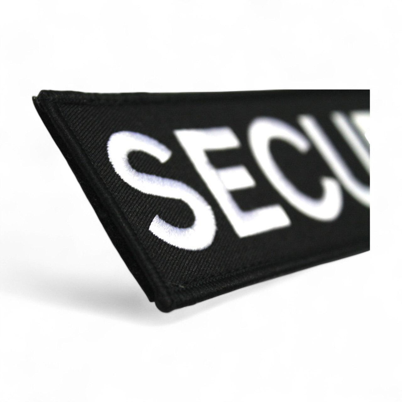 Large embroidered patch with the inscription SECURITY, ideal for professional or decorative use. Made with a black background and highly visible white text, this patch is designed for easy application using a Velcro system, offering secure and removable attachment.
