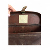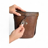Secure flap closure with leather strap and spring-loaded metal fastener;