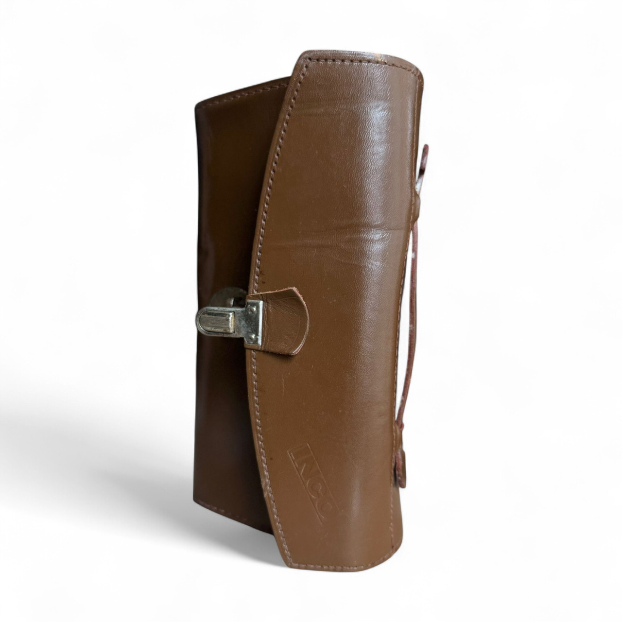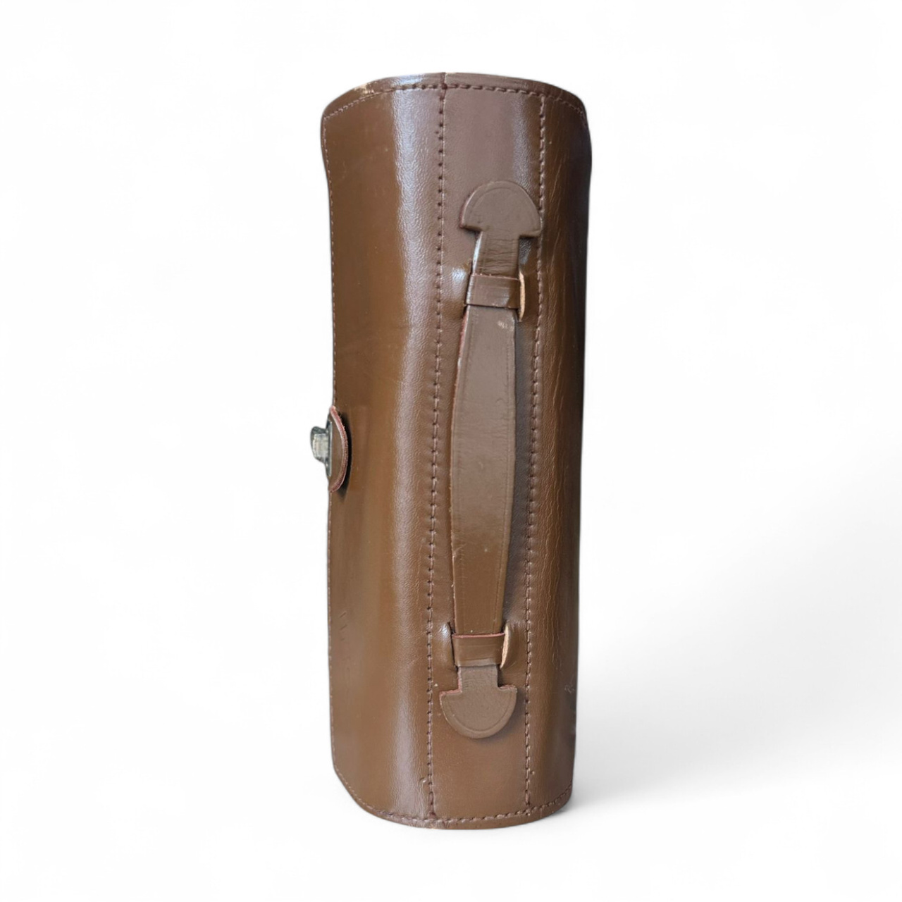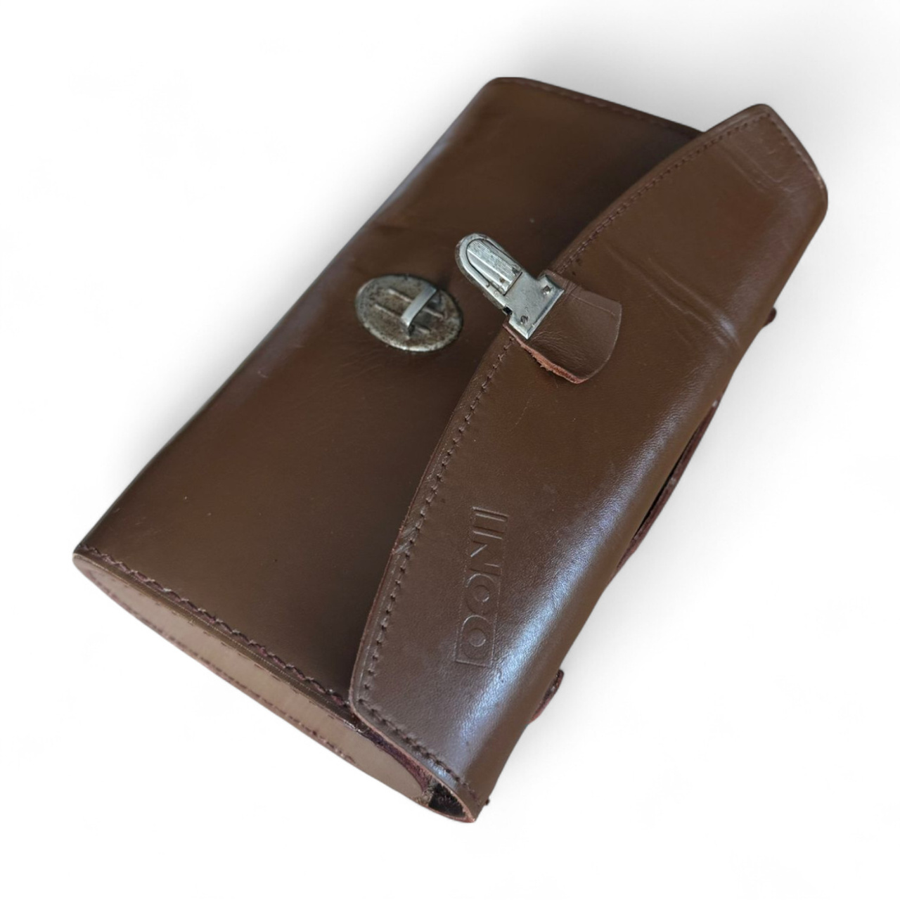 Vintage bag made of natural leather, Romanian military surplus, originally used by military personnel to carry documents, maps and office accessories in the field, with original military stamp from 1983. Made of thick brown leather, with a sturdy metal clasp and top handle for easy transport. The bag has the stamp ‘INCOM’ on the lid, indicating the Romanian manufacturer that supplied military equipment during the communist and post-communist periods.