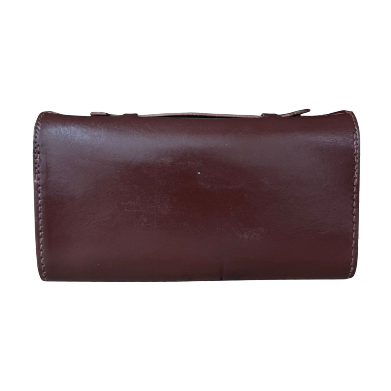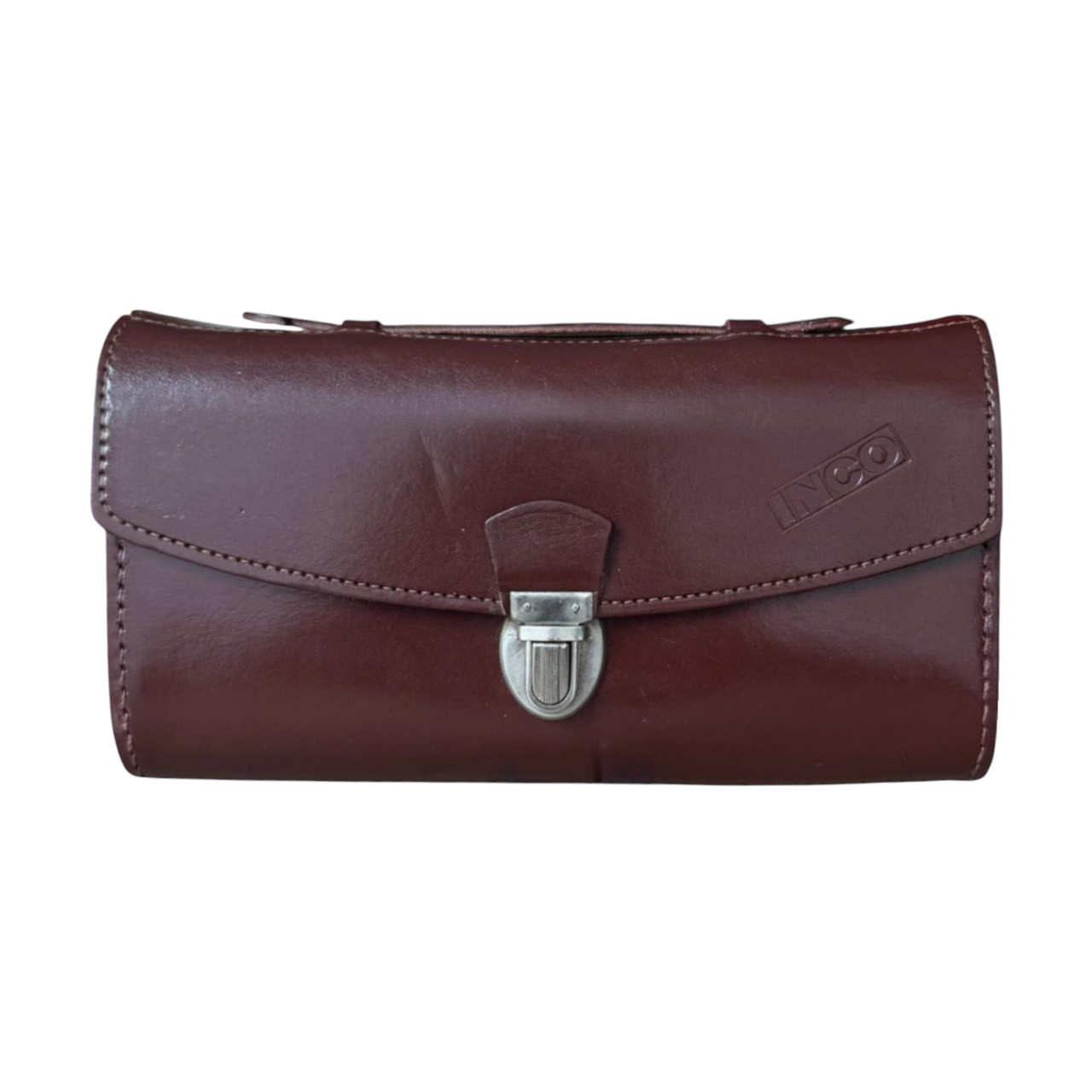 Vintage bag made of natural leather, Romanian military surplus, originally used by military personnel to carry documents, maps and office accessories in the field, with original military stamp from 1983. Made of thick brown leather, with a sturdy metal clasp and top handle for easy transport. The bag has the stamp ‘INCOM’ on the lid, indicating the Romanian manufacturer that supplied military equipment during the communist and post-communist periods.