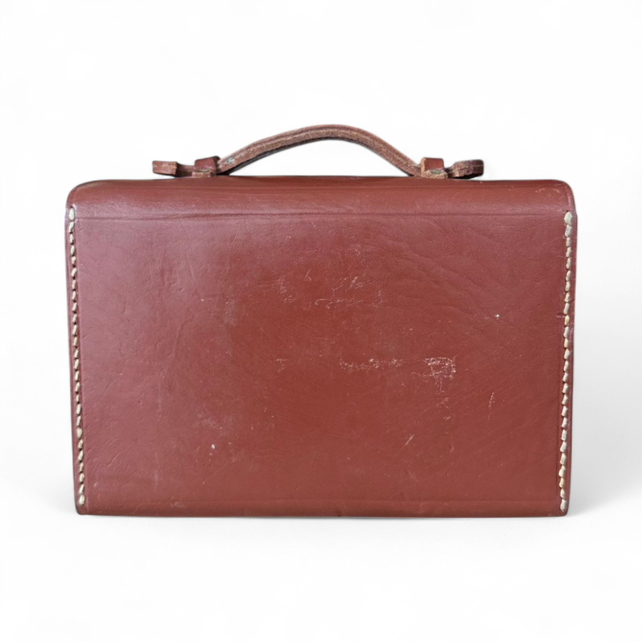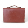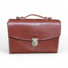 Vintage bag made of natural leather, Romanian military surplus, originally used by military personnel to carry documents and office accessories in the field. Made of thick brown leather, with a sturdy metal clasp and top handle for easy transport.